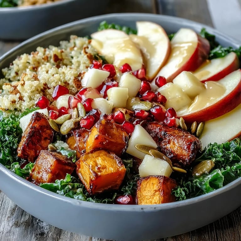 Save This Kale Harvest Grain Bowl is a vibrant and nutrient-packed meal that perfectly balances earthy grains, roasted vegetables, and crisp fresh fruit. Fluffy quinoa and tender massaged kale provide a hearty base, while roasted sweet potatoes add a natural sweetness. Every bite is elevated by the crunch of pepitas and the burst of pomegranate seeds, all brought together by a zesty homemade apple cider vinaigrette.