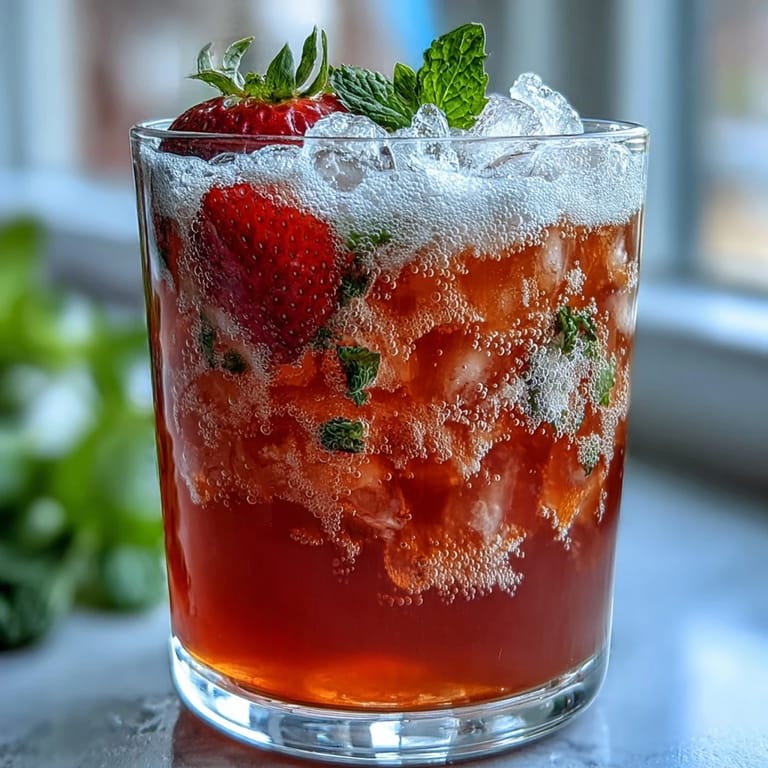Serve in clear glasses to showcase the vibrant pink hue and bubbles. Garnish with fresh mint leaves, lemon slices, and whole strawberries for an elegant and inviting presentation, perfect for spring parties or casual afternoons.
